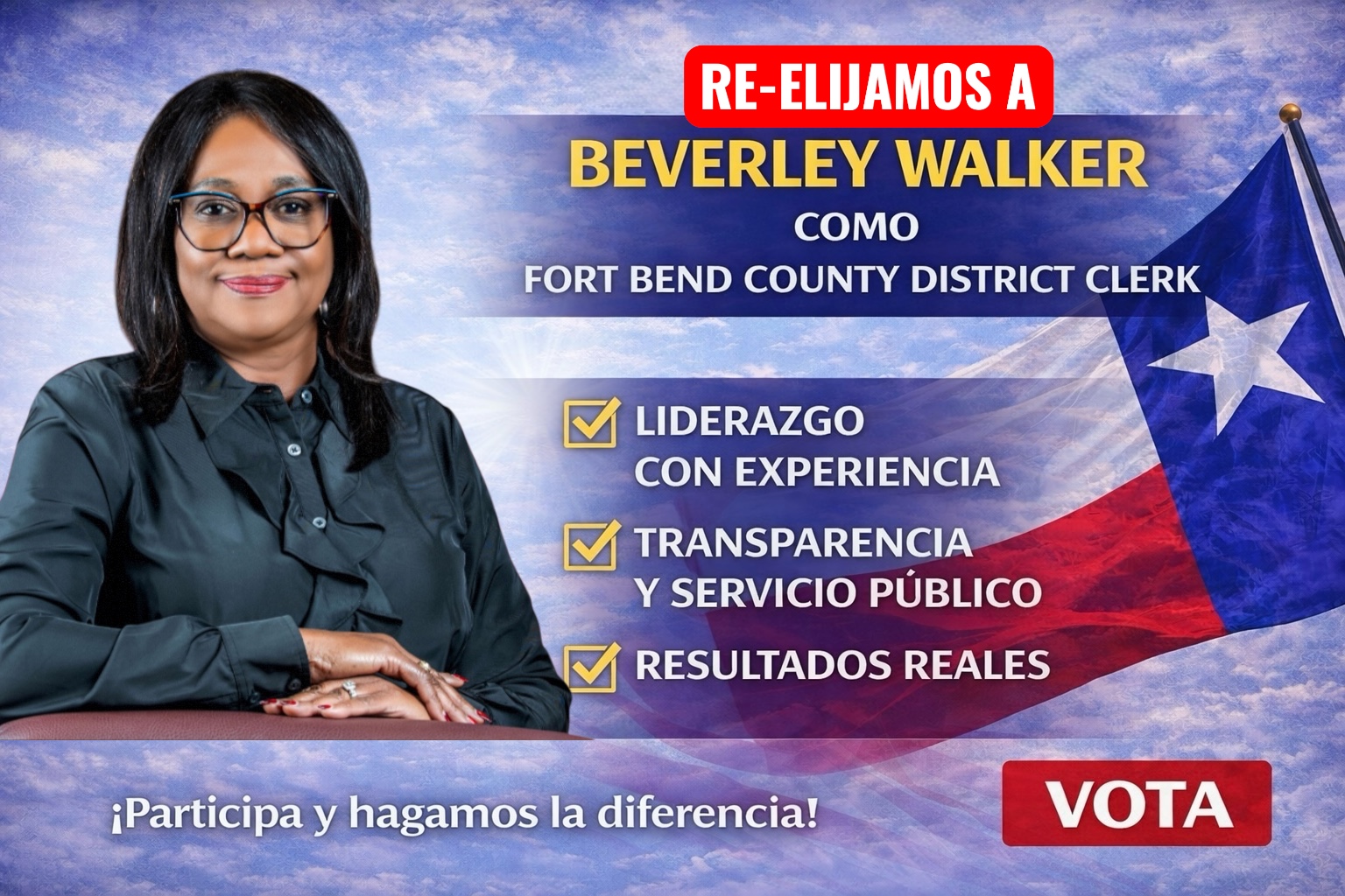 Fort Bend County, Texas — Este Martes 3 de Marzo se celebra una jornada decisiva, y la comunidad hispana de Fort Bend tiene una oportunidad real de hacer sentir su voz en las urnas. Después de una intensa campaña y una activa votación temprana, llega el momento de participar en el Día de la Elección y respaldar la continuidad de un liderazgo con experiencia en la oficina de District Clerk (Secretaria del Distrito).