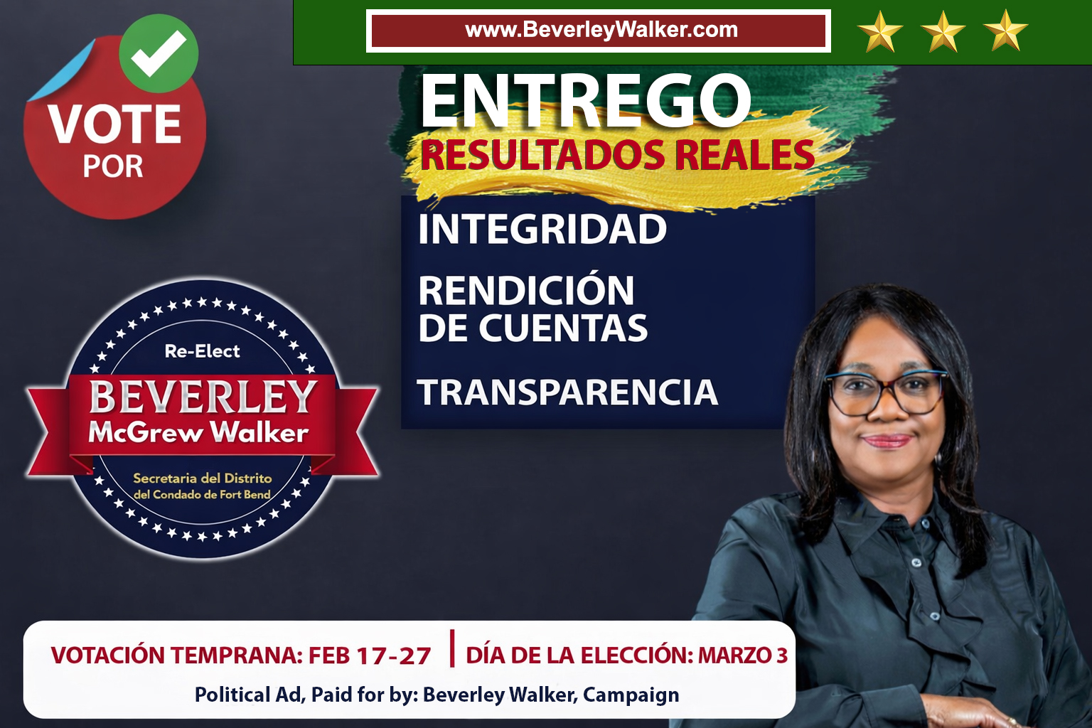 En Fort Bend County, el puesto de District Clerk (Secretaria del Distrito) no es un cargo simbólico: es una oficina clave que impacta el funcionamiento de los tribunales, la eficiencia de los procesos y el acceso de la comunidad a servicios y trámites. En esta contienda, la candidata a reelección, Beverley McGrew Walker, pide el respaldo de la comunidad para continuar con una gestión enfocada en orden, transparencia y servicio.